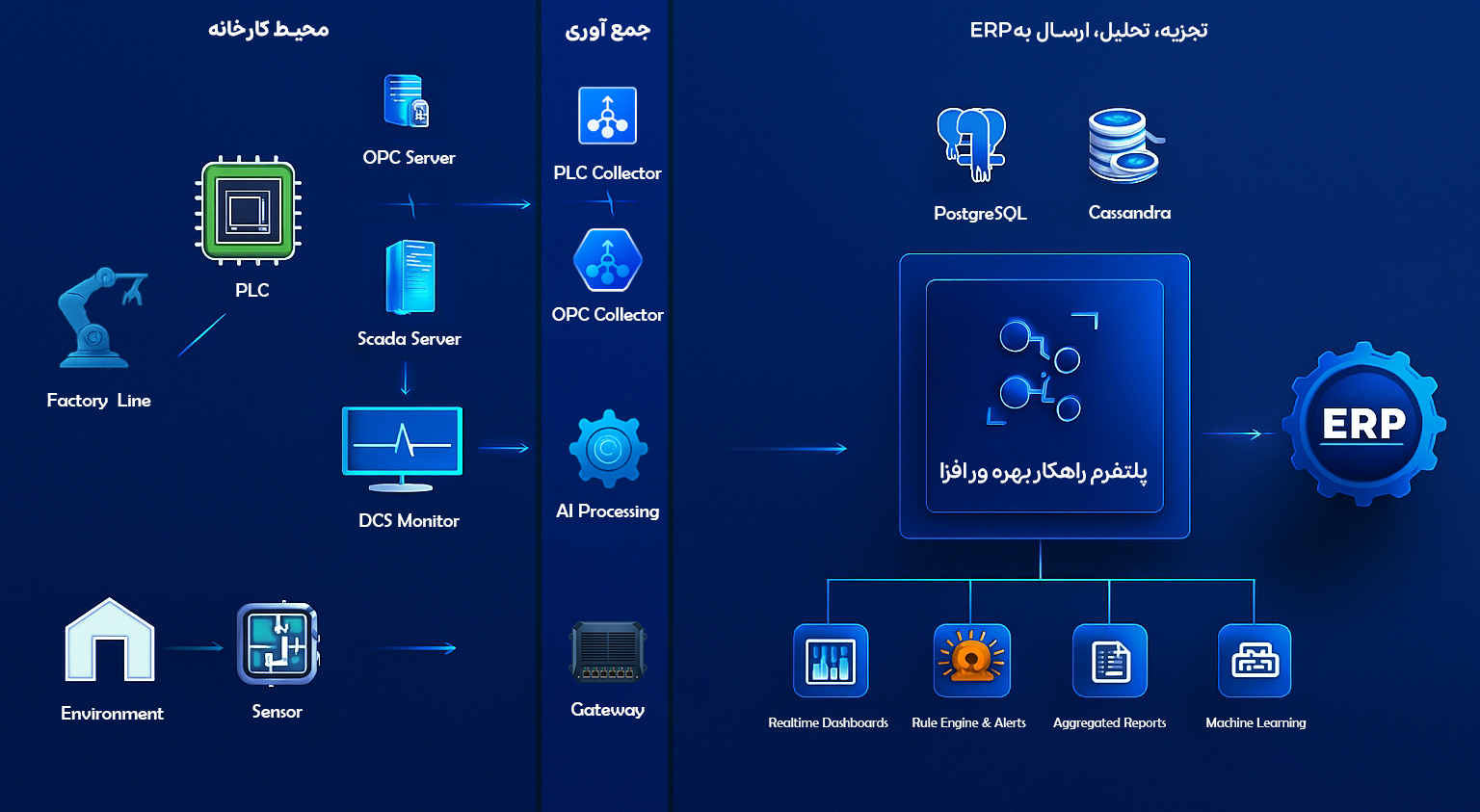 از طریق پروتکلهای استاندارد صنعتی نظیر Modbus TCP، OPC‑UA، MQTT و REST API، دادهها از PLCها و کنترلرهای موجود مشتری دریافت شده و وارد سامانه میگردند.